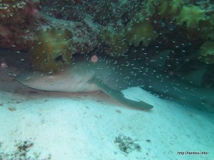 オオテンジクザメ アリ環礁(モルディブ) つぶらな目をしています。おとなしい性格で岩陰でひっそりとしています。近づいても逃げません。 分類 テンジクザメ目ジンベエザメ科オオテンジクザメ属 学名 Nebrius ferrugineus 英名 Tawny nurse shark
