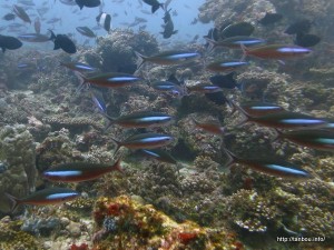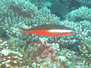 クマササハナムロ アリ環礁(モルディブ) アリ環礁(モルディブ) アリ環礁(モルディブ) 大きな群れをつくって泳いでいます。水中ではわかりにくいですが、腹部がきれいな赤色をしています。尾ビレの上下に黒帯があります。 分類 スズキ目スズキ亜目タカサゴ科クマササハナムロ属 学名 Pterocaesio tile 英名 Dark-banded fusilier