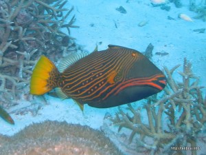 クマドリ ♀, パラオ ♂, サイパン島 ♂, アリ環礁(モルディブ) 体の斑紋が特徴的です。雌には顔にも斑紋がありますが、雄にはありません。サンゴ礁域に生息し、単独で行動します。 分類 フグ目モンガラカワハギ亜目モンガラカワハギ科クマドリ属 学名 Balistapus undulatus 英名 Orange-lined triggerfish