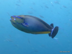サザナミトサカハギ ♂, アリ環礁(モルディブ) 体に散らばる青い斑点が特徴的です。ボートダイビングのエントリー直後などで根の上層を泳いでいるのが見られます。 分類 スズキ目ニザダイ亜目ニザダイ科テングハギ亜科テングハギ属 学名 Naso vlamingii 英名 Bignose unicornfish