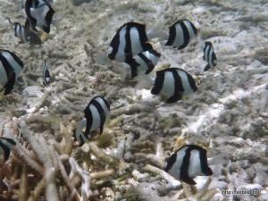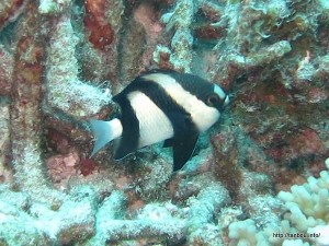 黒い横線が3本入るのが特徴です。近づくとすぐサンゴに隠れてしまいます。